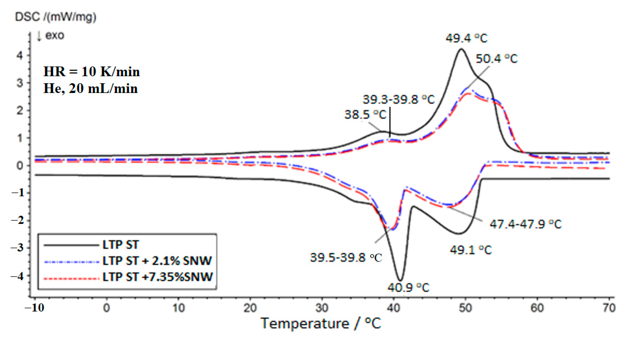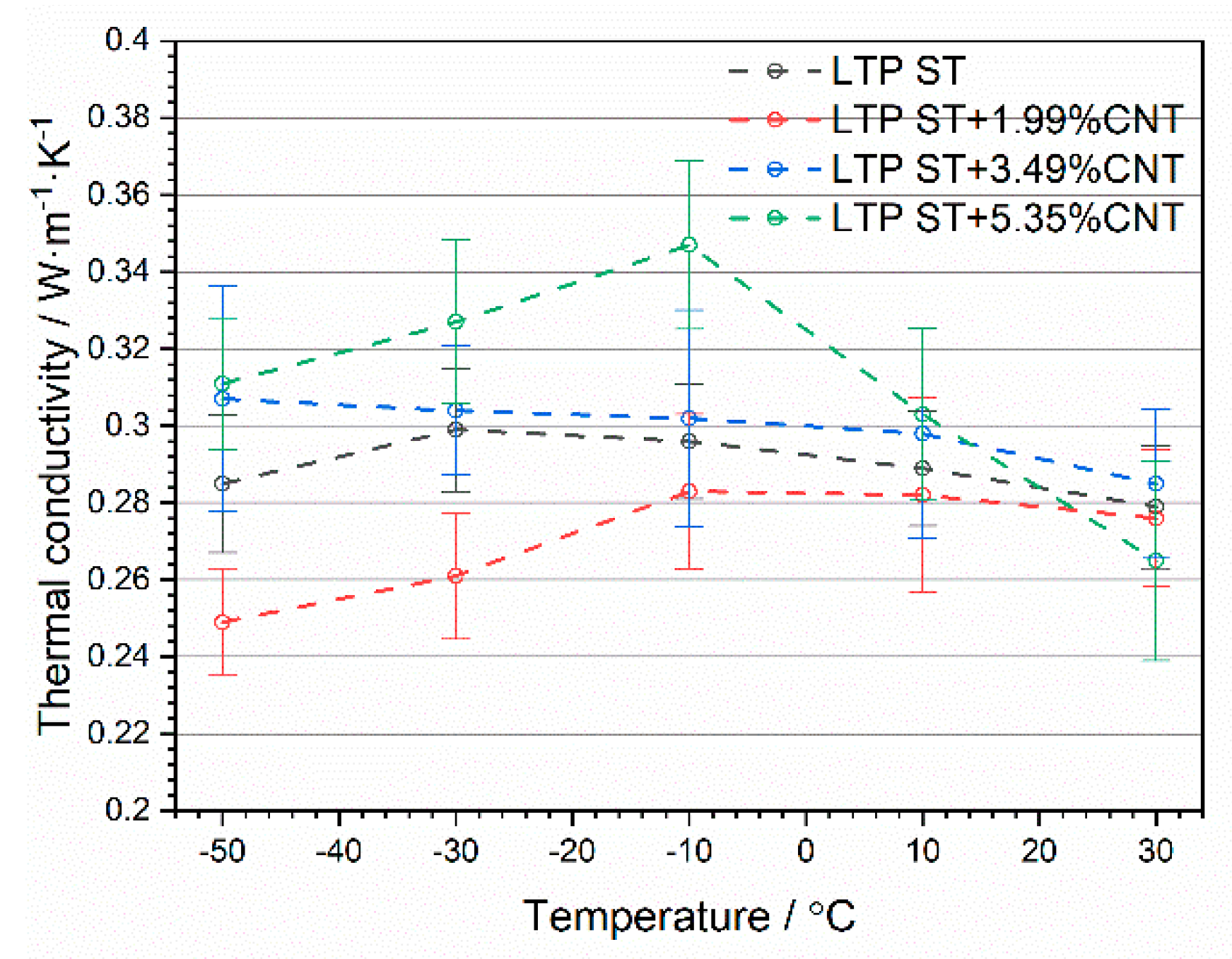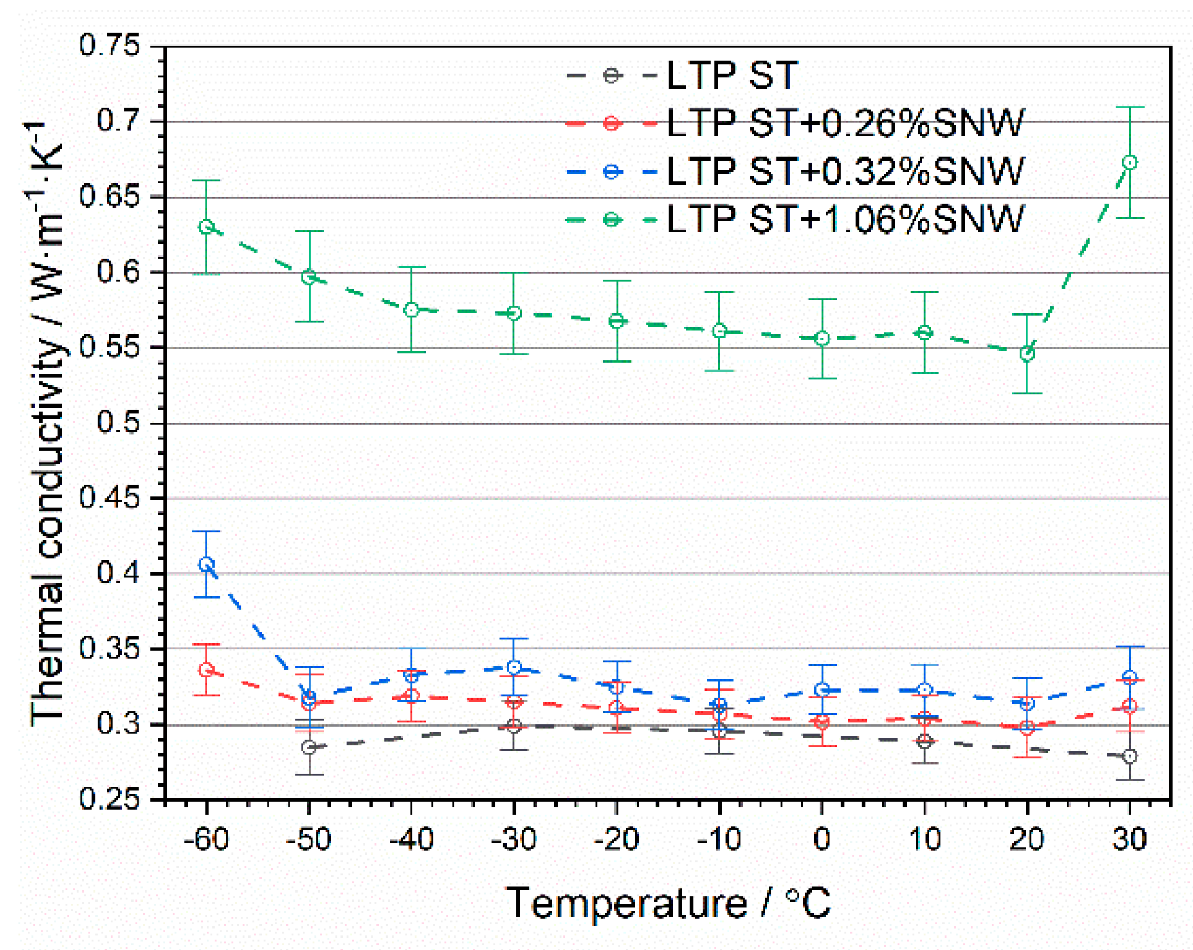 - The average increase in thermal conductivity in the temperature range from −50 °C to 30 °C was 7.2%, 12.4%, and 105.1% for 0.26 wt%, 0.32 wt%, and 1.06 wt% SNW, respectively, and −6.6%, 3.3%, and 7.1%, for 1.99 wt%, 3.49 wt%, and 5.35 wt% MWCNTs, respectively, relative to the thermal conductivity of pure LTP ST paraffin (Table 6).