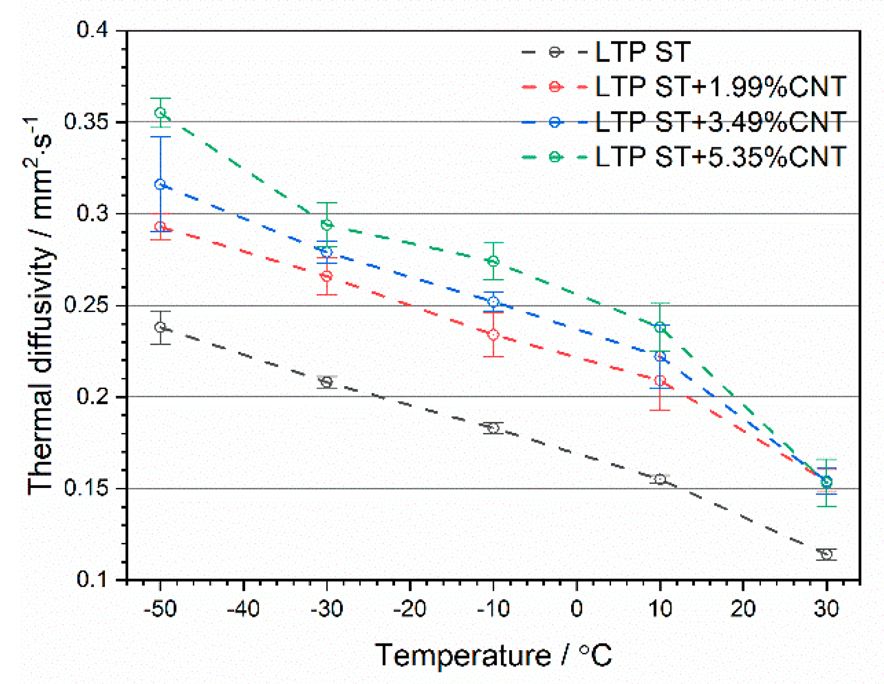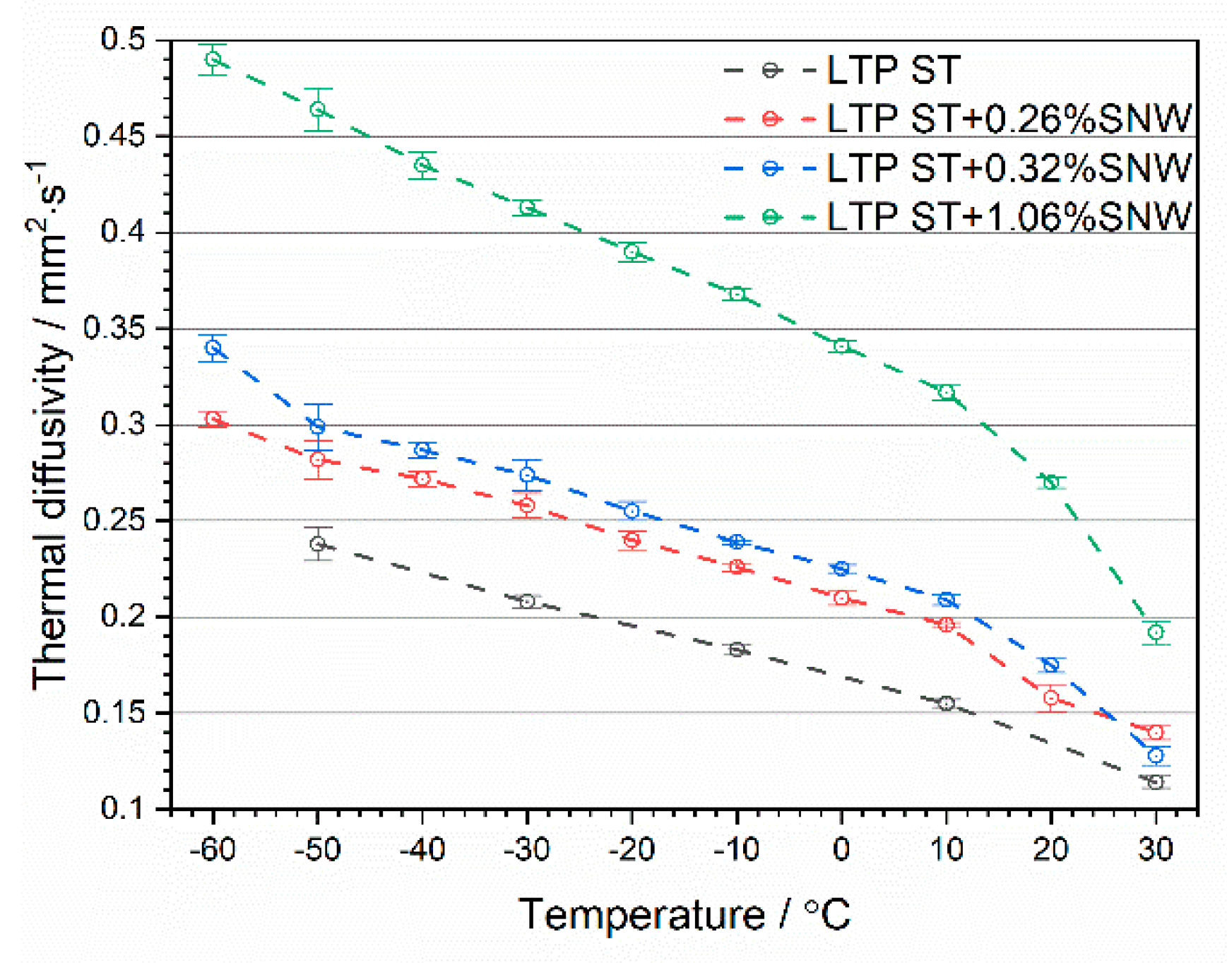 - The average increase in thermal diffusivity in the temperature range from −50 °C to 30 °C was 23.0%, 27.0%, and 93.5% for 0.26 wt%, 0.32 wt%, and 1.06 wt% of SNWs, respectively, and 29.7%, 36.3%, 43.9% for 1.99 wt%, 3.49 wt%, and 5.35 wt%, respectively, of MWCNTs in relation to thermal diffusivity of LTP ST pure paraffin (Table 5).