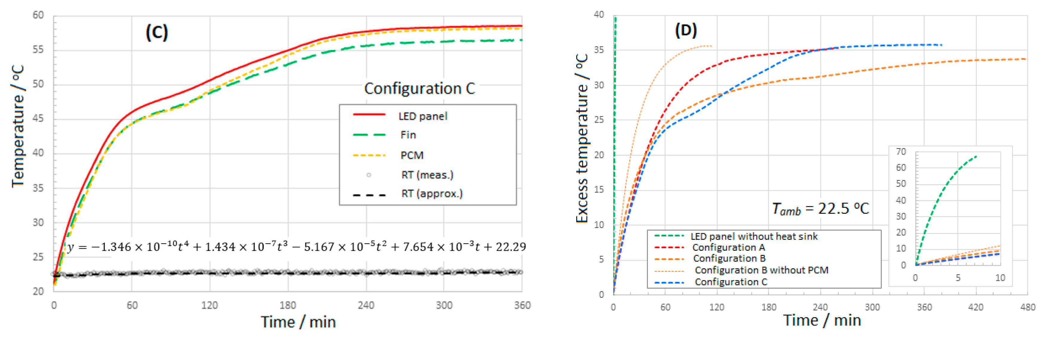 - Configuration C has a 127% longer thermal stabilization time compared with system A. The temperature difference between the LED panel and the fin was 2.1 °C. The use of fins inside the PCM chamber improved the heat transfer to the phase change material and to the lid with external fins. This is evidenced by a direct comparison of configurations B and C with configuration A, which shows lower surface temperatures for the LED panel in configuration C in the first 130 min of operation. In the longer term, the heat sink in configuration B, with more PCM material, gains the advantage. The PCM chamber of C system was reduced by the volume of in-chamber fins, which was 18.7% of the original volume of the B-system chamber as can be seen in Figure 14D.