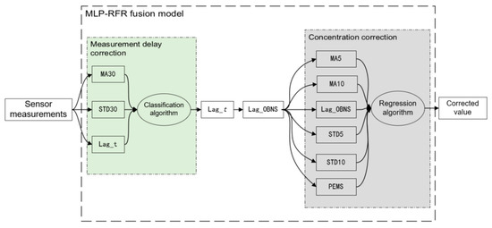 Due to the dynamic delay of the OBNS during the actual measurements, it is quite challenging to achieve satisfactory correction results via a single regression algorithm. Therefore, this research initially proposes the MLP-RFR fusion correction model for correcting the OBNS, as illustrated in Figure 2. The relevant items’ meanings in Figure 3 can be found in Table 3.