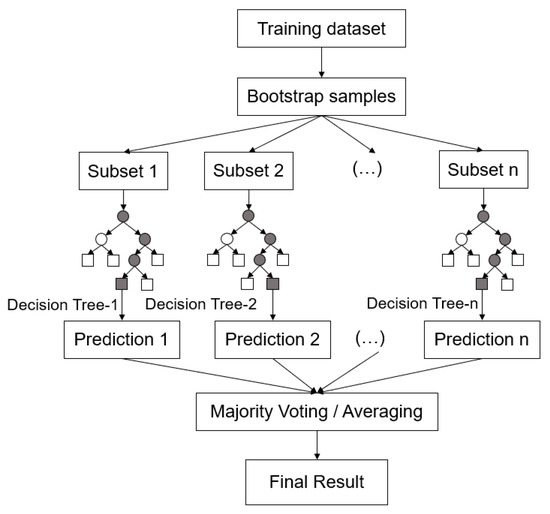 RF is an ensemble learning algorithm based on decision trees, known for its stability and predictive performance [26]. The basic structure of the RF algorithm is illustrated in Figure 5. Multiple decision trees can be utilised in an RF to perform prediction and classification tasks, and then the final decision can be obtained by combining the results of these trees. The primary advantage of the RF is effectively reducing overfitting and improving individual decision trees’ generalisation ability. For regression problems, random forest utilises the variance or the mean square error (MSE) as the criteria for feature selection.