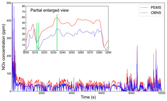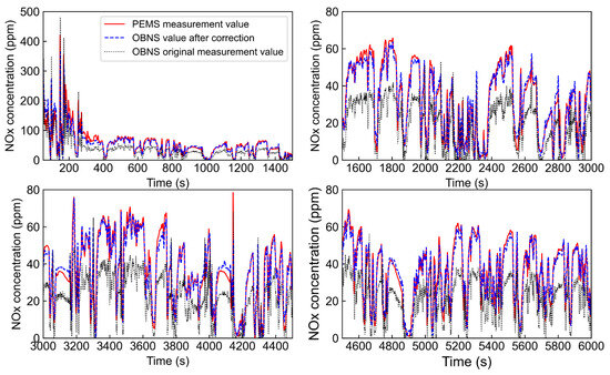 Figure 7 shows that compared to the PEMS emission analyser, the OBNS exhibited the following characteristics in practical operation. First, the average OBNS measurement deviation for the range of 0–50 ppm, 50–100 ppm, and 100 ppm was 12 ppm, 26 ppm, and 70 ppm, respectively. Second, the OBNS exhibited a response delay with an inconsistent time due to the complex and variable nature of actual exhaust environments. Figure 8 indicates that during 13 actual road driving tests, the cumulative relative error of the NOx mass emissions calculated through the OBNS compared to the PEMS tests exceeded 24%. Therefore, it is evident that the original OBNS measurement values are inadequate for accurately representing the actual NOx emissions.