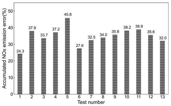 Figure 7 compares the transient measurement results of the OBNS and the PEMS in a test process. Figure 8 shows the cumulative relative error of the NOx mass emission calculated based on the OBNS and PEMS test data in 13 consecutive road tests. The calculation method for the cumulative relative error of NOx mass emission in a single test is as follows: