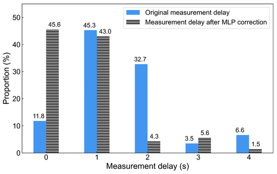 Figure 9 presents the delay correction results of the OBNS measurement based on the MLP algorithm for the testing set. It can be observed that the measurement delay correction model based on the MLP algorithm exhibited superior correction effectiveness. The window proportion with a 0 s measurement delay increased from 11.8% to 45.6%, while the proportions of 2 s and 4 s decreased significantly. Consequently, the MLP algorithm was adopted to construct the measurement delay correction for the OBNS in the following research.