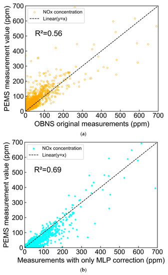 In addition, OBNS measurements are more sensitive to the actual working environment due to their electrochemical reaction characteristics [13,14]. Fischer et al. [13] and Just et al. [14] demonstrated that the measurement accuracy of the OBNS was strongly affected by the temperature and humidity of the working conditions. The traditional method for sensor measurement compensation is hardware compensation, which requires a high detection performance by a complex and costly design of a sensor control circuit [15,16]. Meantime, software compensation has become a prevalent and accurate method with the advantages of various optimization algorithms. Using long short-term memory (LSTM) networks, Huang et al. [17] trained a temperature and humidity compensation method for OBNS based on sensor measurements, actual NOx concentrations, and the tested gases’ temperature and relative humidity. This method exhibited a suitable temperature and humidity compensation performance and effectively improved the accuracy of the OBNS. Li et al. [18] proposed corresponding correction equations to enhance the measurement accuracy of the OBNS after investigating the influence of actual operating environmental factors, such as temperature and humidity.