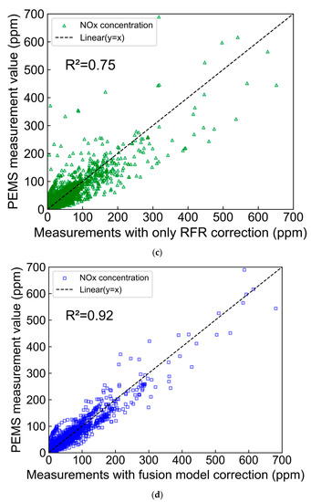 In this study, measurement errors of the vehicle-mounted NOx sensors were successfully corrected using machine learning algorithms, and promising results were achieved. However, certain limitations that offer valuable insights for further development and improvement of the model must be acknowledged. For instance, the training data primarily originated from the low concentration range of NOx data (<90 ppm) when the emission state of the test vehicle was relatively favourable. As a consequence, good performance in correcting low-concentration NOx data was demonstrated by the model. Nevertheless, when higher concentrations of NOx data were confronted, the correction effectiveness of the model decreased due to inadequate representation in the training data. This limitation can potentially impact the accuracy and stability of high-concentration NOx data correction in real-world applications, thereby necessitating further research and refinement.
