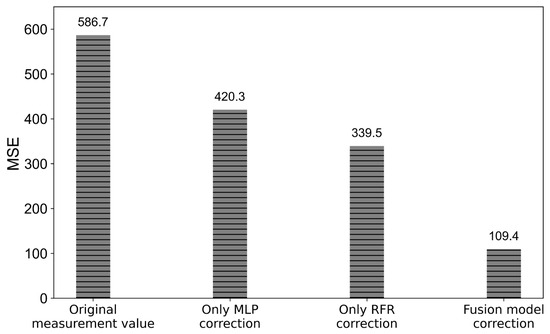 Figure 11 and Figure 12 present the comparative results of the and MSE between the OBNS’s original measurement values, the corrected values using only MLP model, the corrected values using only the RFR model, the corrected values using the MLP-RFR fusion algorithm, and the PEMS test values. It can be seen that the MLP-RFR fusion algorithm exhibited a high goodness of fit for the OBNS signal. The moved from 0.56 to 0.92, while the MSE decreased from 586.72 to 109.42, obtaining a reduction of 81.3%. The results indicate that the MLP-RFR fusion algorithm can significantly improve the sensor’s measurement accuracy. It should also be noted that the RF algorithm without the MLP correction did not achieve satisfactory correction effectiveness for the OBNS measurement values. This demonstrates that the measurement delay correction forms the basis for correcting the measurement values of the OBNS.