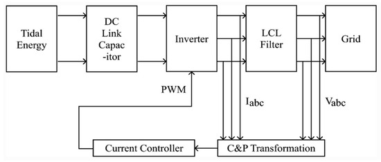 The block diagram presents a grid-connected tidal energy generation system, as shown in Figure 2. The AC output of the PMSG was rectified, and the DC-link voltage was then adjusted to obtain constant voltage by means of a PI controller, and the constant DC-link voltage was inverted to obtain the AC voltage recommended [24,25]. The LCL filter model is shown in Figure 2, where is the inverter-side inductor, is the grid-side inductor, ρ is a capacitor with a series damping resistor, and are inductor resistances, and voltages vi and vg are the input and output (inverter voltage and output system voltage). A three-phase power grid with current-controlled technology utilising PLL and CP transformation, a tidal current and turbine profile, a filter for power factor correction, a DC-to-AC converter, and an LCL filter for harmonic reduction constitute the entire system. Tidal energy by its own nature produces fluctuating voltage [26].
