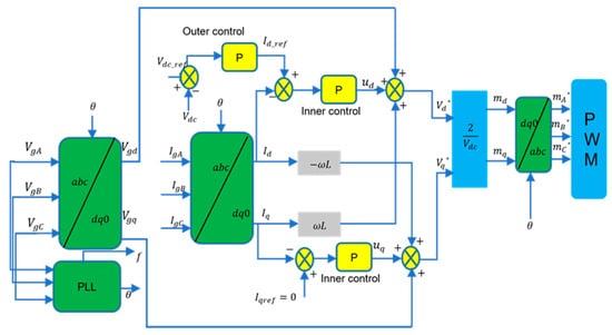 In this study, the system performance was managed using the voltage-oriented control methods illustrated in Figure 3. The system controls the output DC voltage by doubling the current and rapidly responding to changes in its loop configuration. The inner current references are produced by the outer loop’s DC-link voltage control [19].