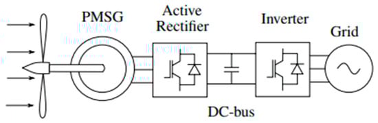 A full-scale back-to-back converter allows a link to be established between the PMSG and the load. The converter is configured by a generator-side converter and a load-side converter [29]. The load-side inverter ensures the conversion of the DC voltage to the AC voltage, and the LCL filter reduces the output voltage harmonics [30]. The composition of back-to-back converters linked to the PMSG tidal energy system is illustrated in Figure 5. Using a supplementary inverter with a PMSG can provide AC power to the grid with constant frequency and voltage [31].