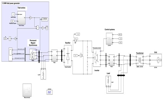 Nowadays, renewable energy sources are being increasingly utilised in electrical systems to mitigate the impacts of climate change. It is anticipated that a significant portion of the future energy mix will comprise renewable sources of energy, which can play an important role given their enormous potential, particularly wave and tidal stream generation [1]. Similarities between offshore wind and tidal stream turbines include the usage of electric machinery, system structure, and control strategies [2]. It has been found that, globally, sources of marine energy are extensive when compared to other renewable energy sources such as wind, solar, geothermal, etc. [3]. However, tidal energy developers have shifted their focus to tidal streams, which offer the major advantage of being near coastal cities and grids [4]. It is noted that tidal power is a predictable energy resource, whose accuracy has been within 98% for decades. This predictability allows tidal power generation to be successfully integrated into electrical grids [4,5,6,7,8]. The typical behaviour of the power system has changed because of the increasing use of renewable energy sources. As a result, the weak grid inertia of the future is likely to be dominated by power electronic interfaces [9]. However, tidal energy generation comes with many challenges, and its integration into the grid presents numerous operational and control difficulties that limit the grids’ ability to run steadily and dependably. Therefore, it is important to maintain the stability of voltage and frequency in the power network by ensuring that harmonic distortions are kept as low as possible [7,10]. In power converters with a rectifier input stage, LCL filters are specially designed to cut down on harmonic current absorption (frequency converters for UPS, motors, etc.). They primarily consist of a parallel-series configuration of inductors and capacitors designed to lower the total harmonic distortions (THDs) of rectifiers [9,11,12]. The tidal energy generation system is connected to the grid via an inverter using an LCL filter that maintains the high quality of grid current by decreasing the frequency harmonics to a lower level, thereby presenting a better dynamic performance [13]. It can be mentioned that LCL is one of the most frequently employed filters in grid-connected filters [14]. The design of LCL filters is the subject of many studies, which either suggest various methods and algorithms to discover the ideal values for the filter’s components or various damping circuits to achieve the necessary attenuation [15].
