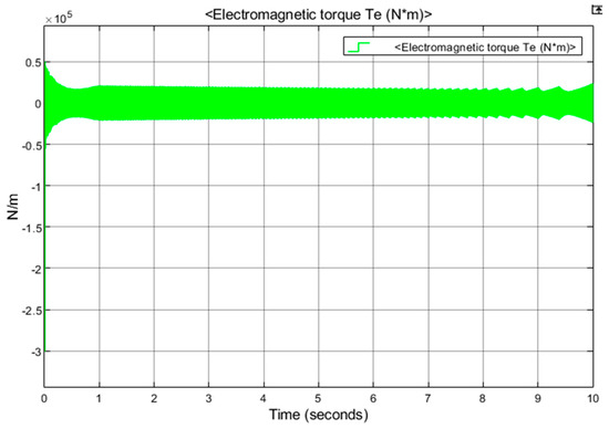 To determine how well the LCL filters can enhance the power quality of a small coastal village load supplied by a grid-connected tidal turbine, the suggested approach was tested using the simplified network shown in Figure 5 and Figure 6. This power system consists of a full-scale power converter connected to the grid using PMSG and a tidal turbine shaft attached to the PMG rotor. Through lengthy three-phase submarine cables, the MV generator output (6.6 KV) is transmitted over land. Typically, an onshore transformer is used to convert the level of voltage tidal transmission LV (690 V). The speed required to run the tidal generator is predicted to remain constant at 12 m/s. At a rotational speed of 7.7 rad/sec, it can be noted that the tidal rotor speed reaches 24 r/min when the tidal current velocity increases to 12 m/s after 10 s. Figure 10 shows that the generator torque eventually reached its maximum of 600 KNm.