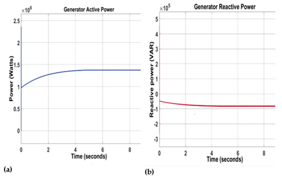 Figure 11a,b indicate that the tidal generator’s active power output was approximately 1.324 MW, and the reactive power of the tidal energy generation is also shown. At the beginning of the simulation, the signal had an overshoot of 233%, a positive undershoot of around 1.055%, and a negative undershoot of about 69.62%.