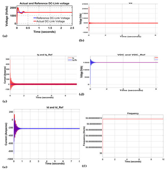 Actual and reference DC-link voltage (a), and Id-ref (b), and -ef (c), (d), and (e), and phase-locked loop (PLL) frequency (f).