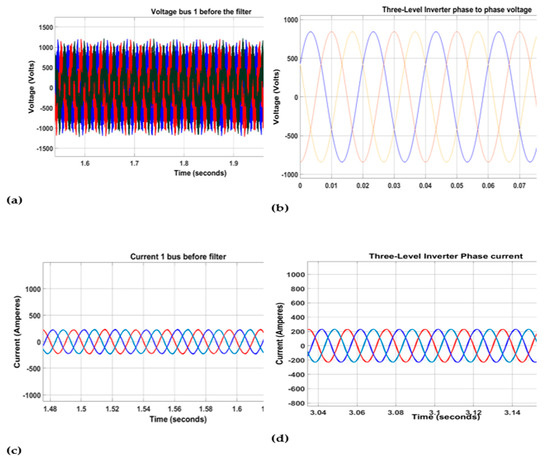 Both signals exhibited harmonics that were greater than the 50 Hz standard system frequency. In Figure 13, the output of the LCL filter is depicted, displaying the phase-to-phase voltages and currents. The voltage magnitudes measured approximately 600 V (Figure 13b), and the phase currents were approximately 1213 A (Figure 13d). The phase-to-phase voltage exhibited a rise time of approximately 5.853 milliseconds, followed by a fall time of 5.837 milliseconds. The voltage also had an overshot of 0.324% and an undershot of 1.985%. Similarly, the phase current had a rise time of 5.819 milliseconds and a fall time of 5.823 milliseconds, with overshoot and undershoot values of 1.99% each.