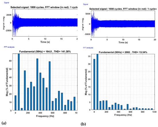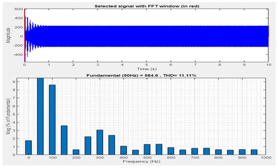 Figure 15 shows the phase-to-ground voltage wave, which had a total harmonic distortion of 141.38%, and the phase current signal had a total harmonic distortion of 13.54%. The total harmonic distortions for current and voltage illustrated in Figure 15a,b decreased by 0.07% and 0.12%, respectively.