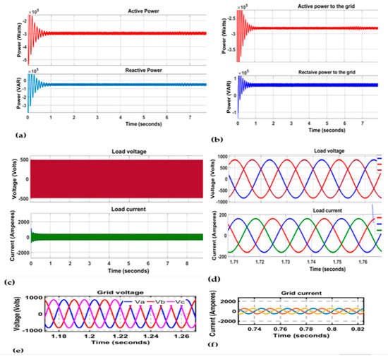 Load active and reactive power (a), active and reactive power (b), load voltage (c), load current (d), grid voltage (e), and grid current (f).