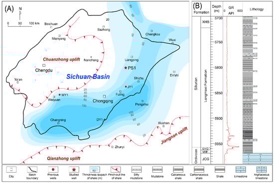 (A) Contour map of the thickness of the Wufeng-Longmaxi formations of organic-rich shales in the Sichuan Basin; (B) Stratigraphic column of the Wufeng-Longmaxi formations for the studied Well PS1 (modified from [25]). JCG = Jiancaogou Formation; WF = Wufeng Formation; GYQ = Guanyinqiao Member; XHB = Xiaoheba Formation.