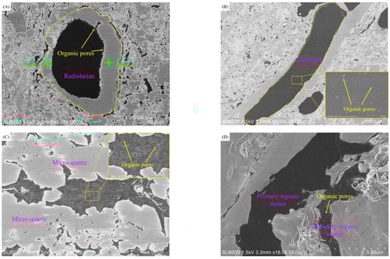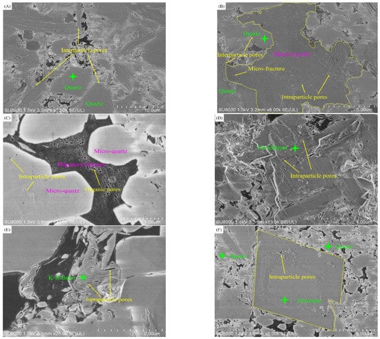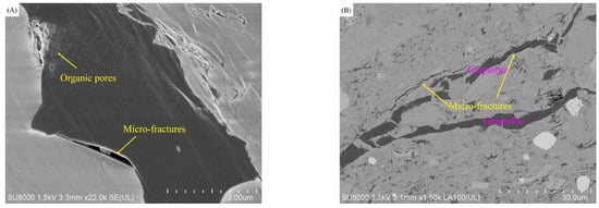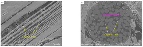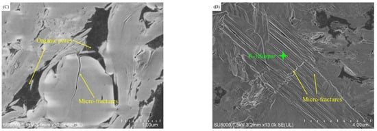 Micro-fractures are mainly developed at the contact edges between OM and mineral matrix and the interior of mineral grains in the WF-LMX ultra-deep shale. The micro-fractures at the contact edges between OM and detrital grains (quartz, feldspar, etc.) were formed due to the changes in the OM volume during hydrocarbon generation and the difference in stress intensity between OM and detrital grains during diagenesis (Figure 4A,B). With the increasing burial compaction, detrital grains are easily fractured to form micro-fractures. The micro-fractures within the interior of grains generally display flat and straight shapes, which are rarely filled by other minerals (Figure 4C). Feldspar grains are susceptible to dissolution, thus forming micro-fractures along the cleavage (Figure 4D). In general, micro-fractures can be connected with organic pores and interparticle pores to form a complex pore network, which can serve as both reservoir spaces and one of the major seepage channels for shale gas micro-migration.