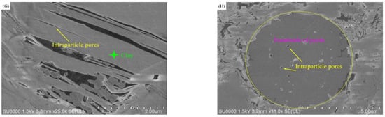 Interparticle pores mainly refer to the unfilled pores that occurred at the contact point of inorganic mineral grains, commonly around rigid and brittle minerals, which are relatively developed in shallow shale reservoirs and have good pore connectivity, thus forming an effective pore network. In this study, interparticle pores are distributed in the shale mineral matrix, mostly on the edges of brittle mineral grains (e.g., quartz and feldspar). The edges and corners of detrital quartz grains are more distinct, and slit-shaped intergranular pores are formed along the edges of rigid grains, and pore size is generally in the range of 1.5–3.5 μm (Figure 2A,B). Biogenic quartz is usually presented as rounded micro-scaled quartz grains (so-called “microquartz”) (Figure 2C). Interparticle pores among these microquartz grains display triangular and angular shapes, which have wide variations in pore sizes, generally 0.1–3 μm. Overall, interparticle pores usually have the characteristics of good connectivity and wide variations in pore sizes, which are relatively developed.