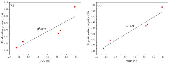 The effect of TOC content on pore structure parameters of shale reservoirs has been widely studied, and it is generally found that there is a good positive correlation between shale porosity (or pore volume) and TOC content. With increasing TOC content, the porosity and pore volume tend to increase, and the porosity is relatively developed within the OM grains [5,34,36].