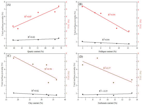 The contents of feldspar minerals and clay minerals are roughly negatively correlated with the TOC contents of the studied shale samples, indicating that feldspar and clay minerals play a dilutive effect on TOC contents and thus are unfavorable for the development of nanopores. Thus, the total surface porosity of our studied shale samples is negatively correlated with the contents of feldspar and clay minerals (Figure 6B,C). The content of carbonate minerals in the WF-LMX shale samples is relatively low, and its influence on pore development is very limited, so no correlation between total surface porosity and carbonate content can be observed (Figure 6D).