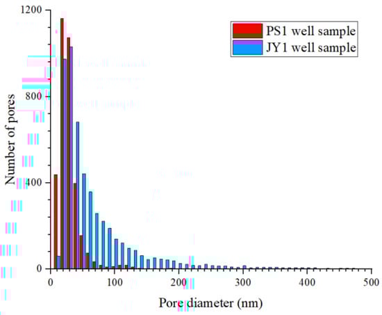 The pore structure characteristics of the WF-LMX mid-shallow shale reservoirs in Sichuan Basin and its neighboring areas have been extensively studied [42,43,44], and it has been found that the pore types of mid-shallow shale reservoirs include organic pores, interparticle pores, intraparticle pores, and micro-fractures. Among them, organic pores are the most important pore type, and they display bubble, ellipsoid, and slit shapes. The pore size distribution of organic pores mainly ranges from 10 to 100 nm, and organic pores with pore sizes larger than 100 nm are also developed. Since organic pores are the main reservoir spaces of shale gas reservoirs and have a great influence on the enrichment and production of shale gas [45,46], the comparison study of reservoir quality between ultra-deep shale and mid-shallow shale mainly focuses on the development of organic pores. The effect of burial compaction on organic pores in shale reservoirs is mainly reflected in the following two aspects: (1) pore morphology and (2) pore size distribution. Previous studies have shown that strong compaction can change the morphology of organic pores [47]. The morphology of organic pores in mid-shallow shale reservoirs includes mostly circular, elliptical, spongy, and irregular honeycomb shapes [48]. With the increasing burial depths, the circular pores gradually disappeared, and pore morphology gradually evolved into slit shapes (Figure 3E). Hu et al. [49] had reported that the diameter of organic pores in the WF-LMX mid-shallow shale samples from Well JY1 ranged from 5 to 1021 nm, with an average of 68 nm. Compared with well JY1, the organic pores of the studied WF-LMX shale samples from Well PS1 were still dominated by mesopores, but the pore size distribution tended to be relatively low, ranging from 5 to 40 nm. Moreover, organic pores larger than 100 nm in diameter were rarely developed in our studied ultra-deep shale samples (Figure 7). Therefore, organic pores would be gradually compacted with increasing burial depths, resulting in a reduction in pore size. The quantity of large organic pores in shale reservoirs from the shallow layer to the ultra-deep layer will gradually decrease. However, the WF-LMX shale reservoirs (especially siliceous shale) contain a large amount of authigenic microquartz grains, which can form a rigid framework to resist burial compaction, and organic pores hosted in solid bitumen could be preserved to some extent. Although the organic pores of ultra-deep shale reservoirs generally display relatively low sizes, they are still well developed, revealing significant potential for shale gas exploration.