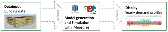 Fernando et al. [8] reviewed physics-based urban modelling tools and identified three heat-balanced driven tools: umi, CityBES and URBANopt. umi is an add-on to a commercial CAD software (Rhino) and does not allow independent generation of energy demand profiles with simple building shapes. CityBES is focused on retrofit scenarios at a city scale [9]. URBANopt was developed as an SDK to simulate the energy performance of low-energy districts [10]. All three tools aim for specialized applications in the urban context. The spatial resolution of all mentioned tools is either at the level of single buildings or at group of buildings, except for umi, which uses floor levels for daylight analysis. TEASER—another well-know urban simulation tool—uses reduced order models representing each building as a single zone and mostly statistical data for defaulting [11]. It is also lacking to provide a graphical visualization of the results. Other similar approaches are mainly based on data (such as [12,13,14]) or combine data with statistics [15]. A detailed literature review by Verwiebe et al. [16] concluded that many existing approaches focus on electric energy demand profiles and that heating demand needs to be considered as well.