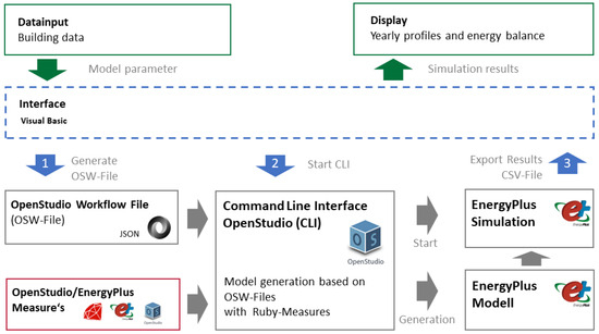 Figure 2 shows more details about this overall process driven by the GUI. The software interface between the GUI to input the data and to view the results and OS is written in VBA. This code collects the input data and generates a JSON (JavaScript Object Notation, a file format for text-based hierarchical key-value store of data.) file. This so-called OSW file contains all of the necessary data about the OS workflow and the parametric EnergyPlus model.
