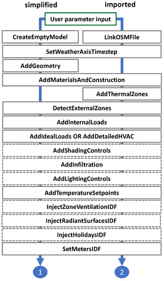 Figure 3 shows the details of the OS-measure workflow including all optional measures. As mentioned above, there are two major options. Creating a model from scratch first generates an empty model and then uses the so-called AddGeometry measure to generate simplified geometry (see Section 2.3.1). Alternatively, geometry defined in an OSM file can be used to start the second workflow option. The OSM file needs to contain at least the geometrical information and can also be generated from native EnergyPlus IDF. When using an OSM file, only the geometrical data are used and all other objects are ignored. For both options, the weather file and the timestep are set (SetWeatherAxisTimestep) as well as constructions and materials (AddMaterialsAndConstruction), which are defined. For the imported file, thermal zones need to be generated (AddThermalZones), which is not needed for the simplified workflow since the zones get generated automatically at an earlier stage (AddGeometry). For both workflows, zones with external windows are identified (DetectExternalZones). The workflow continues to add internal loads (AddInternalLoads) to the model. The next step adds HVAC systems (AddDetailedHVAC). In early development stages of the tool, a simplified approach to model HVAC systems was used, but it has been eventually replaced by a more complex one due to its limitations (see Section 2.3.2).
