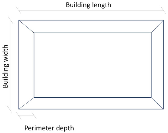 The building geometry can either be provided in the form of an OSM file or be automatically constructed from a set of basic geometric parameters. For the automatic construction of a model, the required parameters include: building width, building length, perimeter depth (the distance in a perimeter zone from the exterior wall inward, see Figure 4), azimuth, number of floors, floor height and the window-to-wall ratio on the north/south/west/east facades. If the adiabatic interfaces between blocks are used as described in Section 2.3.1, these can be toggled in any configuration of the six interfaces.