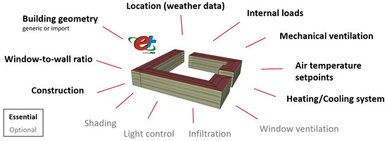 As indicated in Figure 3, the user can either import an existing OSM file (right side) or generate a simplified geometry based on a number of building geometry parameters (left side of the figure). Based on these two options, a number of measures are required while some others are optional.