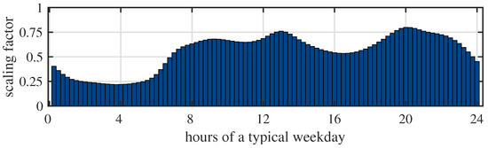 An example of a daily schedule with a resolution of 15 min for the utilisation of electric devices in a residential building, according to standard schedules by [20], for multiplication with a specific energy demand.