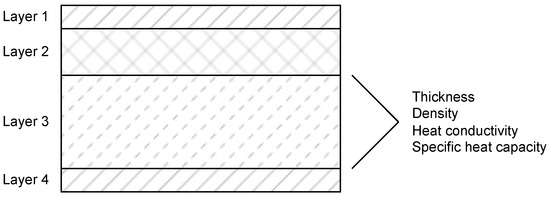 Some of the required parameters of the building envelope, namely the heat transfer coefficients (U-values) for external walls, the roof and the ground floor, are calculated based on parameters of the construction materials. Each building element, e.g., an external wall, is modelled as being composed of up to four material layers. Each material layer has four attributes: thickness, density, heat conductivity and mass-specific heat capacity. Figure 7 shows an example of a wall construction with four material layers.