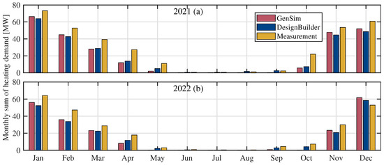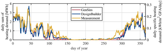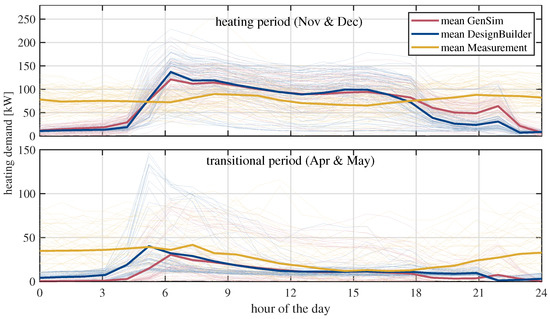 Comparing the measured mean daily heating energy demand curves to the simulated ones, it can be observed that the measured values are mostly constant throughout the day. This implies that there is no setpoint temperature reset during nighttime. In addition, this effect could also be caused by the different heating system of the simulation models. Water radiators, as used in the simulation models, react much faster to heating demands compared to the underfloor heating system of the real building that has quite slow reaction times due to its attached thermal masses. Moreover, the measurement data are recorded directly after the heating system before distribution, while the simulation tools neglect the losses of the distribution system as they provide the sum of the thermal energy of each room within the model.