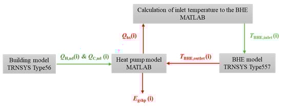 This section gives a basic overview of the analyzed cases, calculation methods, and models used to simulate both the borehole heat exchanger and ground-coupled heat pump operation. The assumptions made for this study are also specified. All analyses were conducted based on a realistic full-year GSHP system operation. Figure 1 illustrates the basic flowchart of the analysis and the relationship between the models used. The green parameters indicate input data in each time step, while the red parameters represent observed outputs.