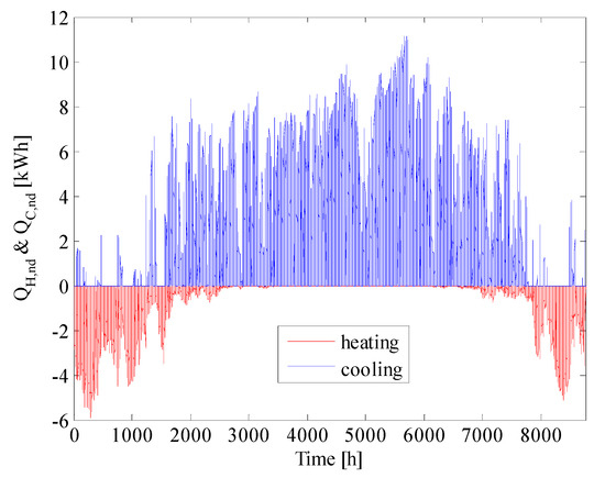 Hourly heating and cooling needs of the reference nZEB single family house in continental Croatia.