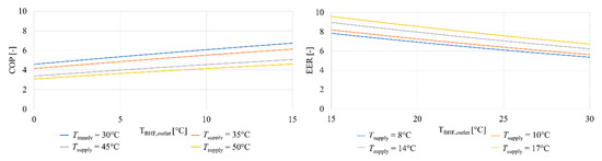 COP and EER as a function of supply water temperature provided to heating and cooling elements and outlet fluid temperature from the borehole. The plotted values are provided from the manufacturer’s data sheet for the heat pump BlueBox Omega Sky Xi LGW.