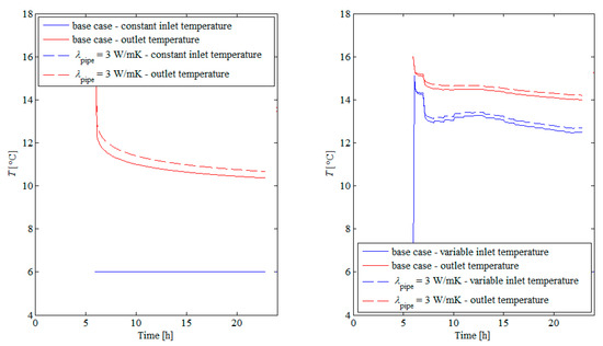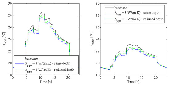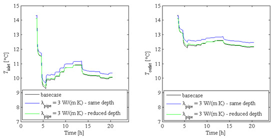 As mentioned earlier, most studies investigating the improvement of BHE have focused solely on the BHE component rather than simulating the entire system operation. However, such an approach can lead to unrealistic assumptions about certain parameters. For example, many studies have assumed a constant fluid inlet temperature, which does not reflect actual system operation. Here, we demonstrate the potential drawbacks of such an approach. Figure 8 illustrates inlet and outlet temperatures for one day of the heating regime for two BHE types, the base case (with pipe thermal conductivity equal to 0.4 W/(m K)) and the BHE with modified pipe thermal conductivity (with pipe thermal conductivity equal to 3 W/(m K)). The left plot represents the case where the constant fluid inlet temperature of 6 °C is assumed in both BHE configurations (as typically assumed in other studies) and the resulting outlet temperatures. In contrast, the right plot shows inlet and outlet temperatures in the case of realistic system operation, where the initial inlet temperature was set at 6 °C, and inlet temperatures in other time steps were calculated using (3). When constant inlet temperature was assumed, the increase in pipe thermal conductivity resulted in a 7.57% increase in heat exchanged with the ground (112.85 kWh/day for the base case BHE, compared with 121.39 kWh/day for the modified BHE). However, when a more realistic system simulation was performed, heat exchange was influenced by the heating requirements of the building. In this case, the increase in pipe thermal conductivity results in negligible improvement (0.15%) of heat exchanged with the ground (32.34 kWh/day for base case BHE, compared with 32.39 kWh/day for the modified BHE). The results indicate that the effects of certain BHE improvements can be significantly overestimated if the overall system operation is not simulated. This highlights the importance of analyzing the overall system operation for a realistic evaluation of BHE improvements.