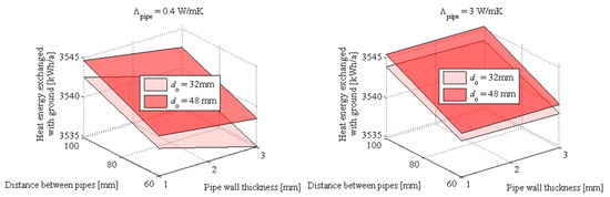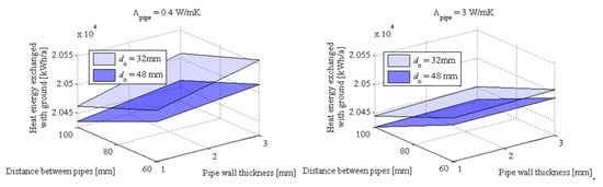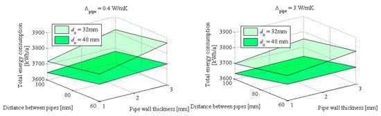 Total energy consumption as a function of analyzed parameters—summed for heating and cooling regime. The left plot presents results for the thermal conductivity of the pipe equal to 0.4 W/(m K), and the right for the thermal conductivity of the pipe equal to 3 W/(m K).