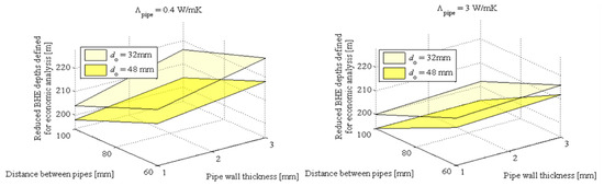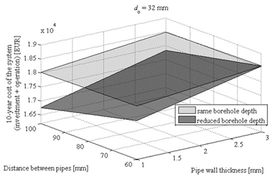 The results suggest that savings in energy consumption and consequent savings in operational costs are not significant for improved BHE configurations. Hence, potential savings in investment costs related to BHE depth are additionally analyzed here. For this analysis, the BHE depths were reduced in the case of modified BHEs, to attain the same heat exchanged with the ground for all BHE configurations. As a result, the energy consumption and corresponding operational costs of the system were the same for all configurations. The aim was to identify the optimal trade-off between savings in operational (same depth) and investment costs (reduced depth). Estimated costs were calculated considering 10-year system operation. Figure 12 shows the example of 10-year costs (both for heating and cooling) for a BHE with a 32 mm pipe diameter and 0.4 W/(m K) pipe thermal conductivity. Changes in 10-year costs shown in this figure are affected by changes in two parameters: pipe wall thickness and distance between pipes. The results suggest that the most effective strategy for all configurations is to reduce BHE depth to save on the initial investment costs. In particular, if influential parameters from Figure 12 are simultaneously improved, achieved savings in total energy consumption are relatively low (2.83%) if borehole depth is held constant. In contrast, more significant cost savings (9.63%) could be achieved by reducing the borehole depth. Corresponding depth reductions affected by changes in all analyzed parameters are shown in Figure 13.