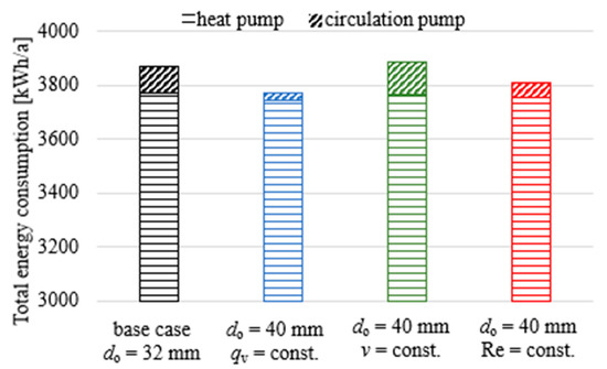The aim of this analysis was to identify the potential differences and benefits of using a certain flow condition when comparing BHE with different pipe cross-sections. Analyzing this factor in the study required comparing the heat transfer rate and energy consumption of a ground-coupled heat pump system using different BHE pipe diameters. Specifically, the base case was 32 mm in diameter, while the modified BHE was 40 mm in diameter. Three flow conditions were analyzed when the pipe diameter was increased: the flow rate, velocity, and Reynolds number. The flow conditions for the base case were predefined and used as a comparison criterion for the modified BHE. The study simulated the system performance over a year in both heating and cooling regimes, with the condition being to deliver the same amount of heating/cooling energy, regardless of the BHE configuration used. The results in Table 4 and Table 5 indicate that heat exchanged with the ground remained nearly constant, regardless of the pipe diameter and flow condition criteria used. The improvements in heat exchange with the ground were below 1% between the base case and all cases with modified diameters. The same conclusion applies to the energy consumption of the heat pump. However, when the energy consumption of the circulation pump is included, some differences can be noticed (Figure 14). The energy consumption of a circulation pump, among other things, depends on the pressure drop that occurs in the BHE. Therefore, it is part of the system where the biggest changes are noticed when pipe diameter and flow conditions are modified. Therefore, considering the total system energy consumption, including the circulation pump, is crucial, especially when changes in the pipe cross-section are investigated. The lowest energy consumption was achieved with the modified BHE that had the same volume flow rate as the base case. On a yearly basis, the modified BHE with a constant flow rate had approximately 2.51% lower energy consumption than the base case BHE (summed for heating and cooling). In contrast, the modified BHE with constant velocity had slightly higher (around 0.49%) energy consumption than the base case BHE. Calculated pressure drops for each configuration are as follows: 63 Pa/m for the base case, 18 Pa/m for qv = const. condition, 45 Pa/m for v = const. condition, and 28 Pa/m for Re = const. condition. The circulation pump operated 4018 h/year in the heating regime and 4558 h/year in the cooling regime.