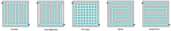 - Interdigitated: high water removal capacity, homogenous distribution of reactants, and high pressure drops;