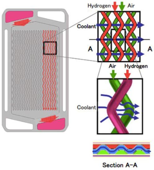 - Chen, Q.; Zhang, G.; Zhang, X.; Sun, C.; Jiao, K.; Wang, Y. Thermal management of polymer electrolyte membrane fuel cells: A review of cooling methods, material properties, and durability. Appl. Energy 2021, 286, 116496. [Google Scholar] [CrossRef]