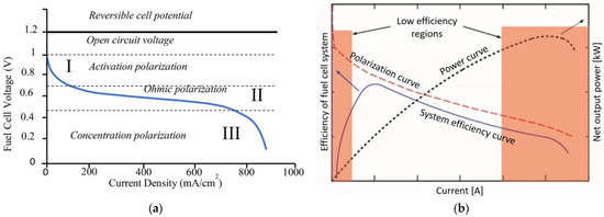 - A nearly constant temperature of about 80 °C: Membrane hydration strongly depends on saturated steam pressure, which is an exponential function of the temperature. Excessive temperature may give rise to membrane dryness, resulting in high ionic resistance, ohmic losses, and material degradation. Meanwhile, low temperatures facilitate the formation of liquid water products, with a higher risk of electrode “flooding”, oxygen starvation, and large mass concentration polarization. Furthermore, it hinders the CL’s electrochemical reaction kinetics and the membrane’s proton conductivity [112];