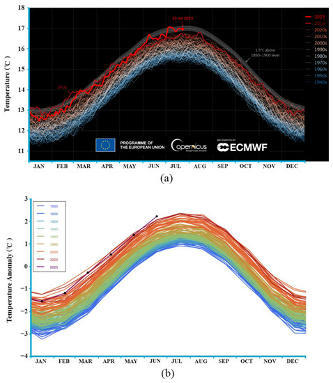 Figure 1. (a) Global daily surface air temperature from 1 January 1940 to 23 July 2023, displayed as a time series for each year and (b) temperature anomalies during the period 1980–2015 [26,27].