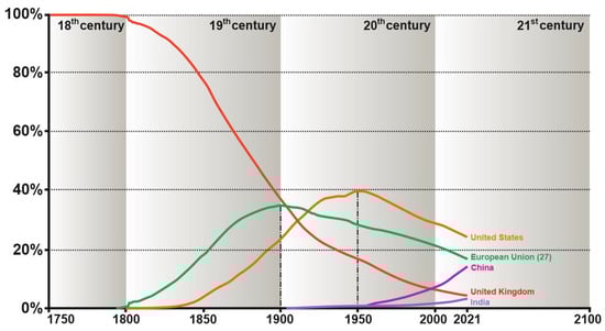 Figure 2 shows share of global cumulative CO2 emissions in 2021 as a percentage, while Figure 3 shows the development from 1750 to 2021 [29]. Two maximum values can be observed in 1900 for the European Union (27) and 1950 for the US.
