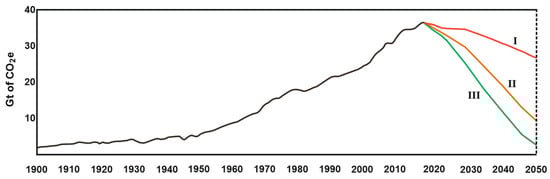 Figure 4 shows the global carbon emissions from energy combustion and industrial processes, and their annual change from 1900 to approximately 2020 [14] and the projected figures towards 2050 [30]. Here, three main scenarios, which are crucial in understanding and predicting global carbon emissions, are expected: (I) New Momentum, (II) Accelerated, and (III) Net Zero. These scenarios offer different routes to tackle global carbon emissions. New Momentum envisions the energy system’s current path, driven by heightened decarbonization goals. Accelerated shows moderate advancement in clean technology and policies. Net Zero is ambitious, targeting emissions reduction through strategies such as carbon capture and behavioral changes. New Momentum follows trends, Accelerated seeks moderate change, and Net Zero aims for transformative emission reduction.