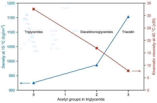 As can be seen, an increase in the number of acetyl groups implies a decrease in viscosity. This is due to the substitution of fatty acids (with chains of 14 to 24 carbons) in the triglyceride molecule for acetate groups (with two carbons). Therefore, owing to this interchange, the molecule size diminishes, subsequently heightening its packing degree and density. This leads triacetin to achieve a density value that approaches that of glycerol (1261 kg/m3 at 20 °C).