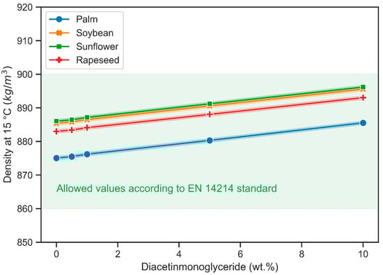 There is research in the literature on the effect of the addition of triacetin on some biodiesel quality parameters. Some authors found that the addition of glycerin triacetate (triacetin), in amounts greater than 10% by weight, slightly increased the density and lowered the freezing point of biodiesel [11]. Later, Garcia et al., studied the effect of triacetin on oxidation stability, density, kinematic viscosity, flash point, cold filter plugging point (CFPP) and acid number of biodiesel [12]. On the other hand, Saka and Isayama confirmed how incorporating triacetin led to a reduction in the cetane number and an elevation in both density and viscosity. Concurrently, it marginally enhanced the cold properties and augmented the stability against oxidation [3]. Finally, Melero et al., also studied density, viscosity, PP, CFPP, oxidation stability and flash point, obtaining similar results [13]. Recent studies indicate that triacetin enhances both CP and PP, without any adverse effects on the CFPP [9,14,15]. Regarding diacetinmonoglyceride, there are no previous studies in the literature related to its properties.